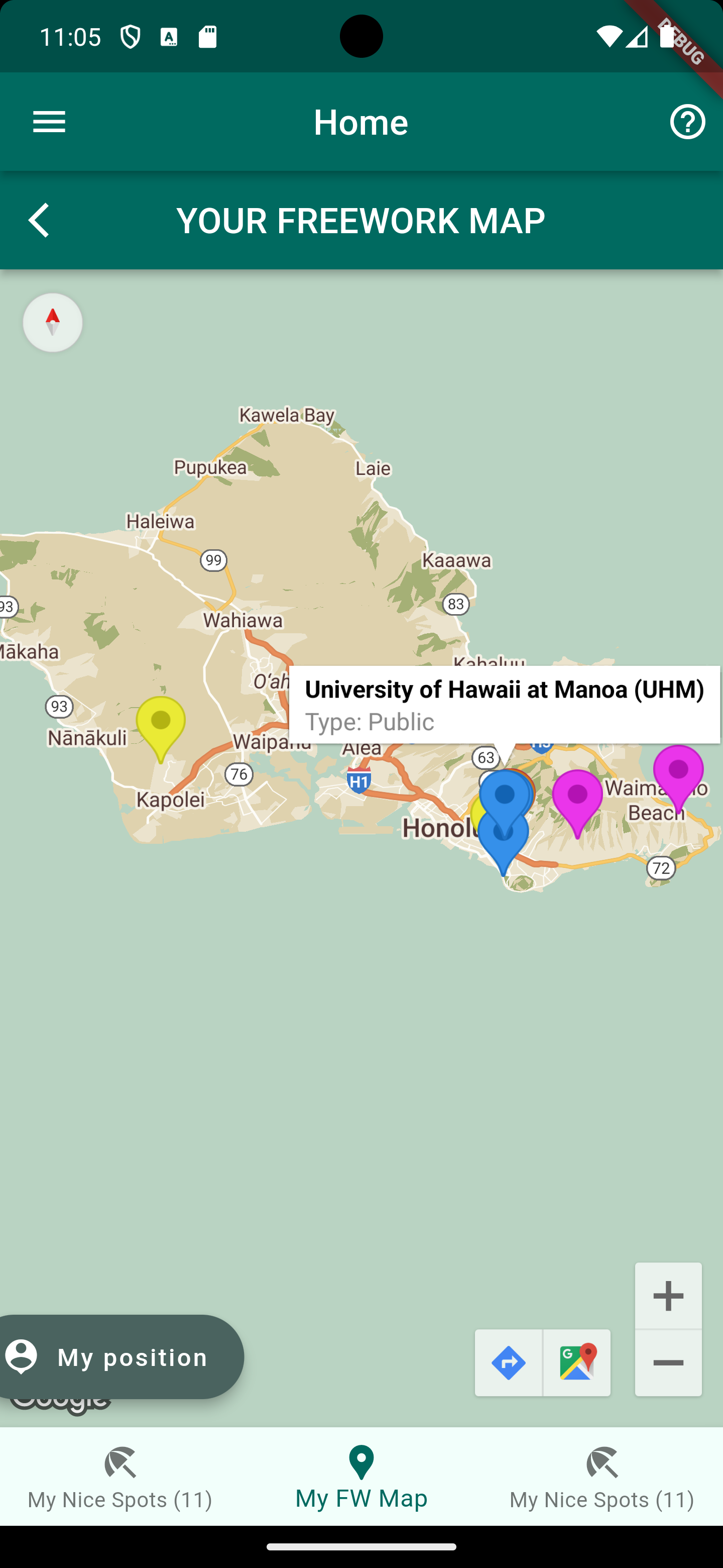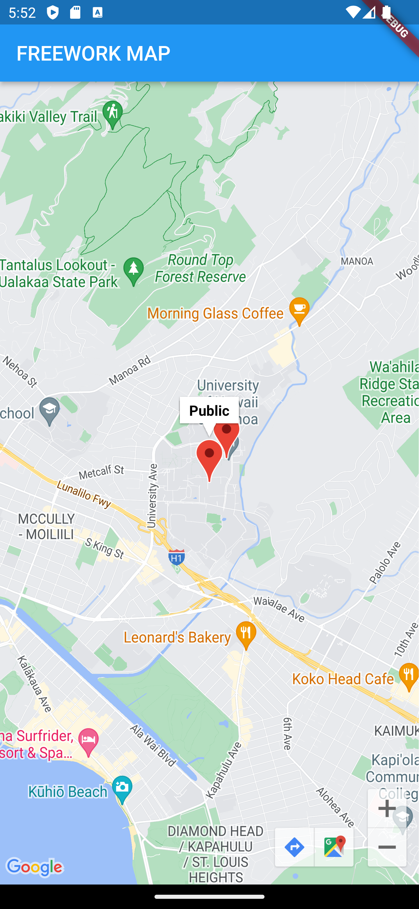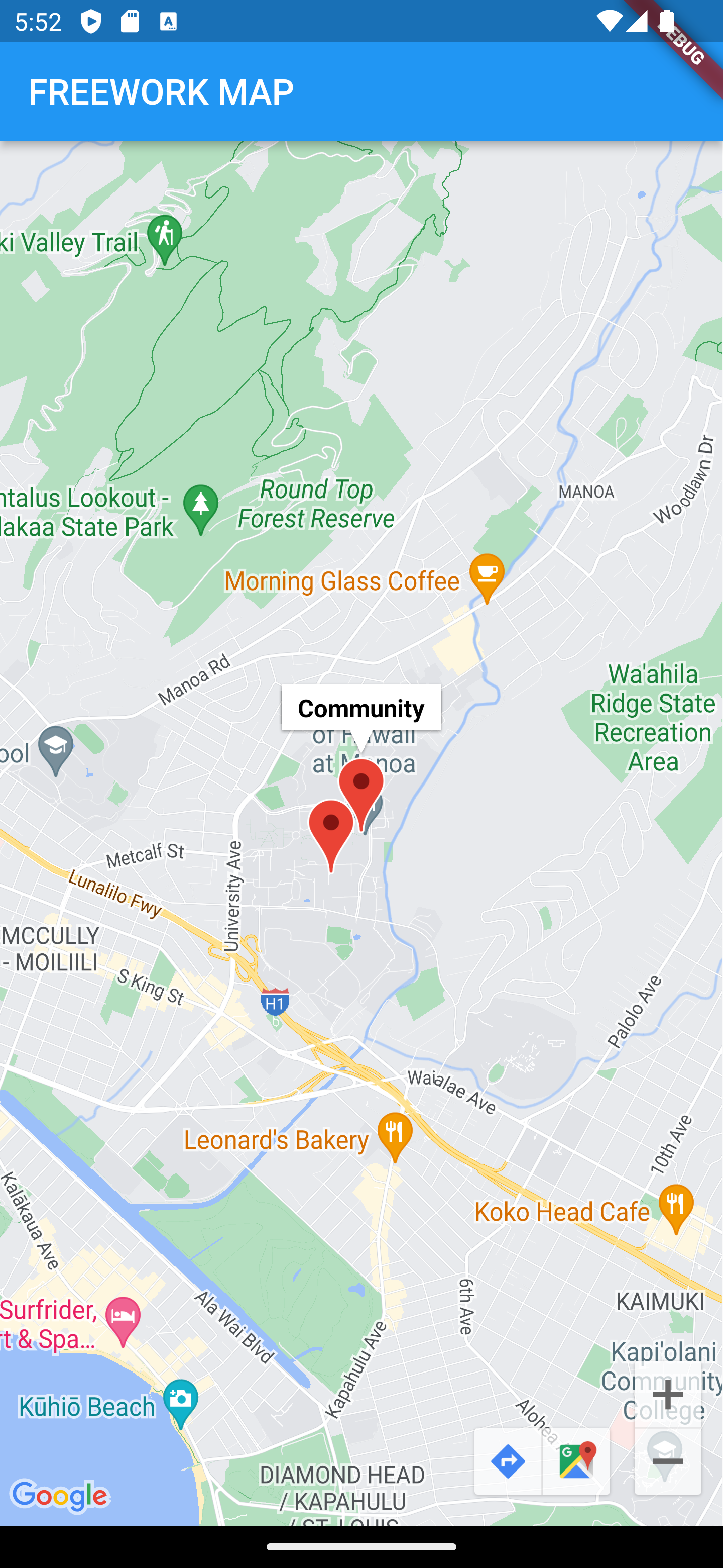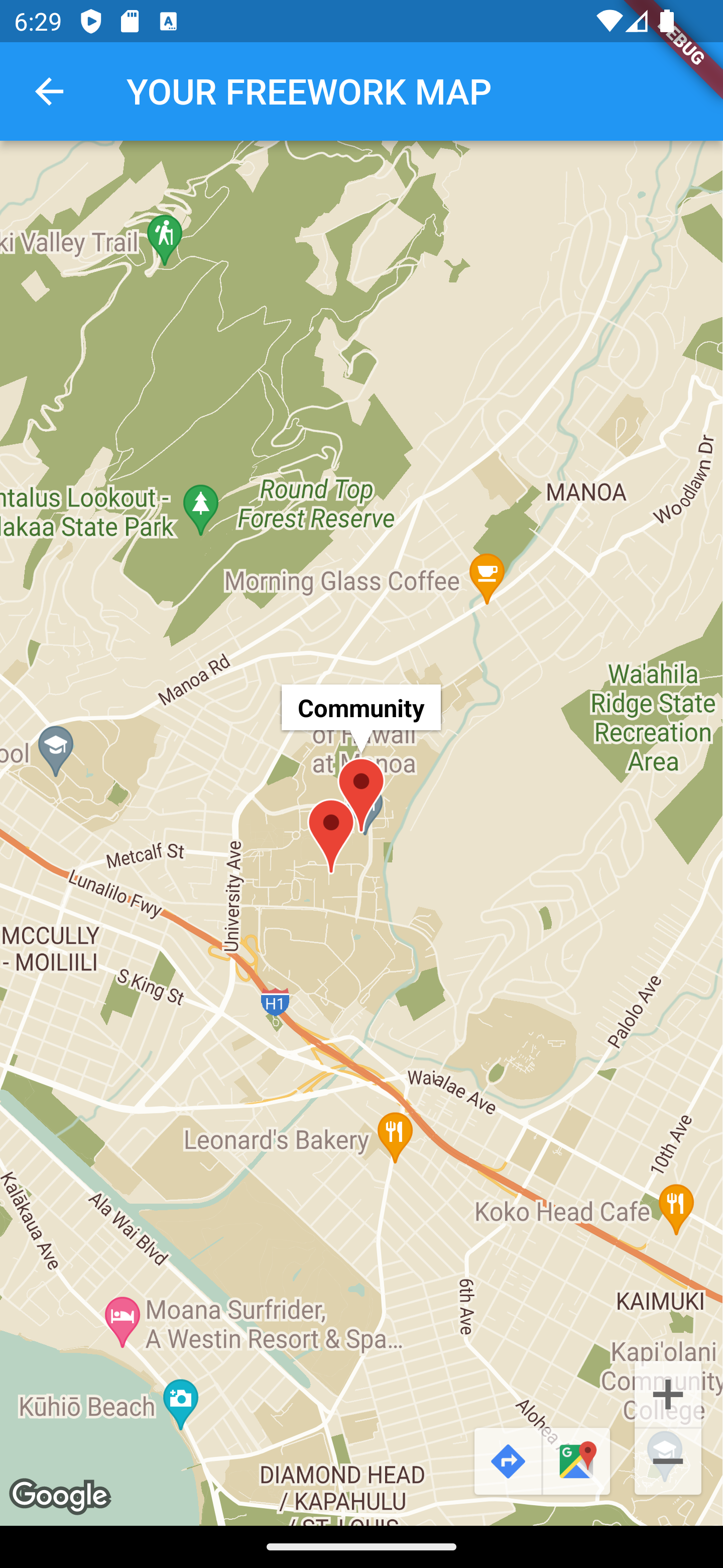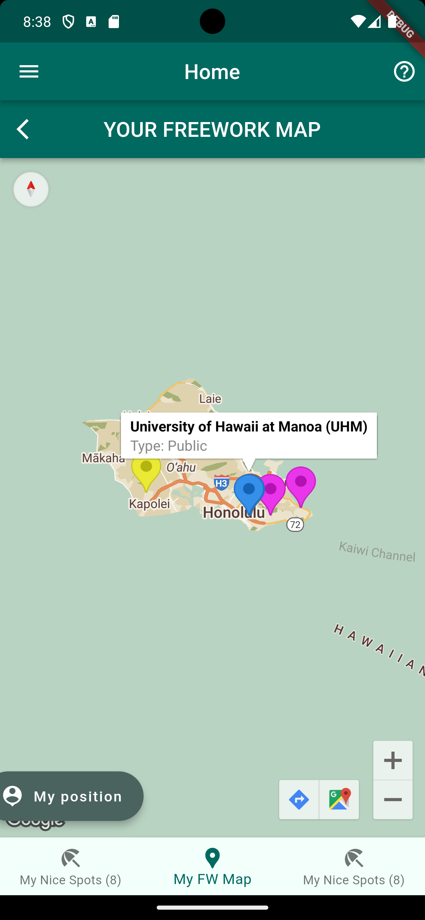 The map also enables a button to jump to your current position as well as buttons as links to GoogleMaps for the navigation, once you choosed your FREEWORK spot for the day.